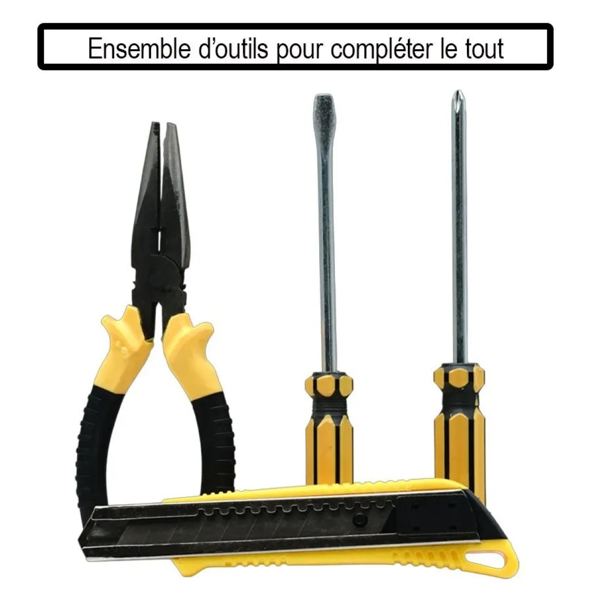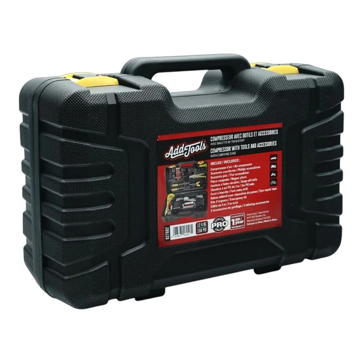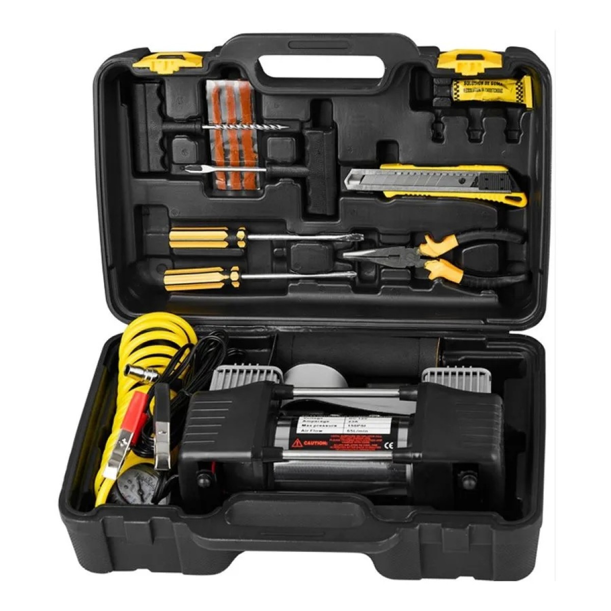 La mallette rigide incluse contient un ensemble complet d’accessoires : un boyau en PU de 3 m, plusieurs embouts de gonflage ainsi que des outils utiles comme un tournevis, une pince et un couteau à lame sécable. Cette combinaison permet d’effectuer de petites interventions d’urgence tout en bénéficiant d’une utilisation simple et intuitive.