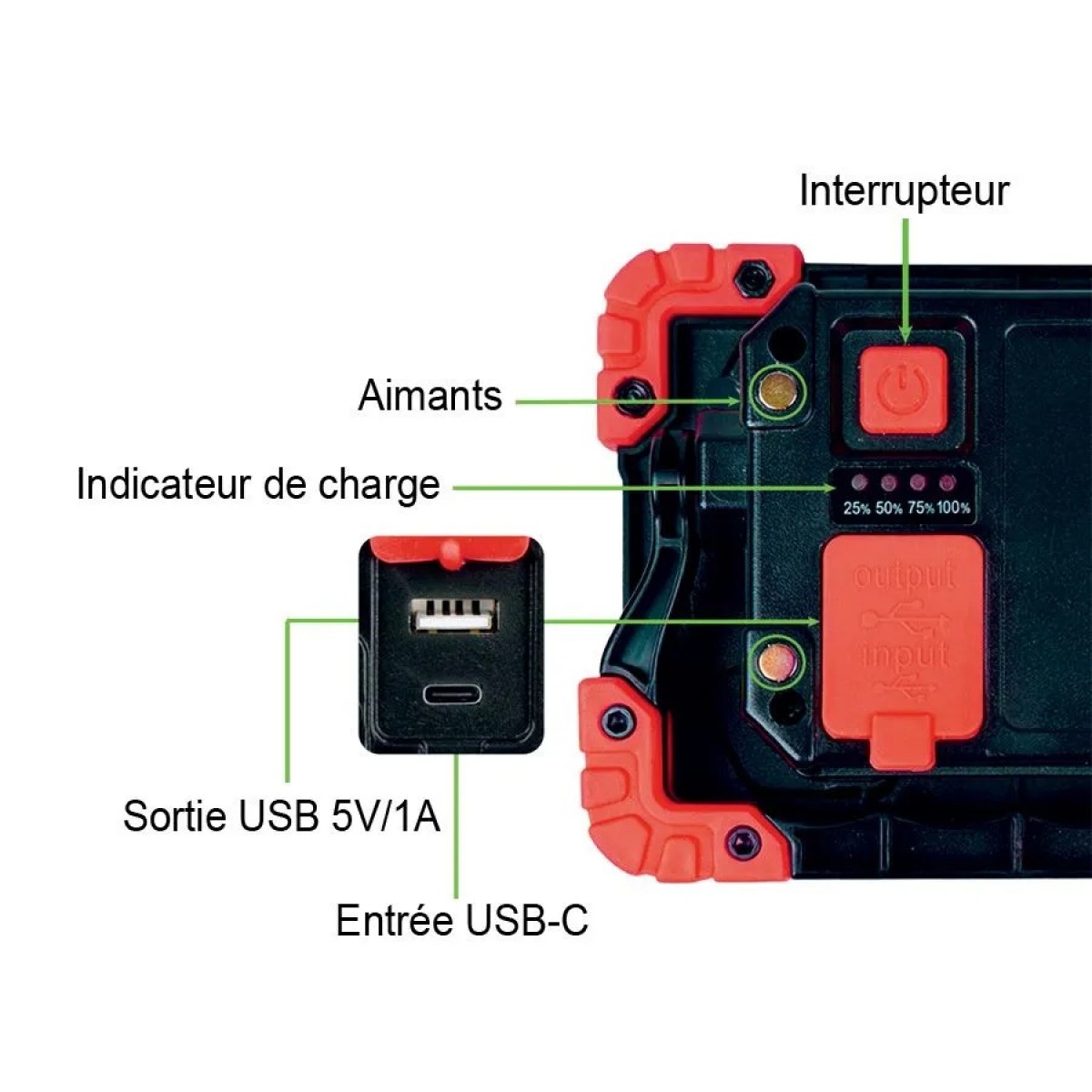 Designed for convenience, this rechargeable LED work light charges easily via USB-C and doubles as a powerbank with its USB-A 5V/1A output, allowing you to recharge electronic devices. Featuring strong magnets for attachment to metallic surfaces and a multiposition stand that also serves as a handle, it provides excellent versatility. Shock-resistant, compact (12.5 x 9.5 cm), and backed by a 1-year warranty, this LED work light is the essential tool for safe and dependable lighting.
