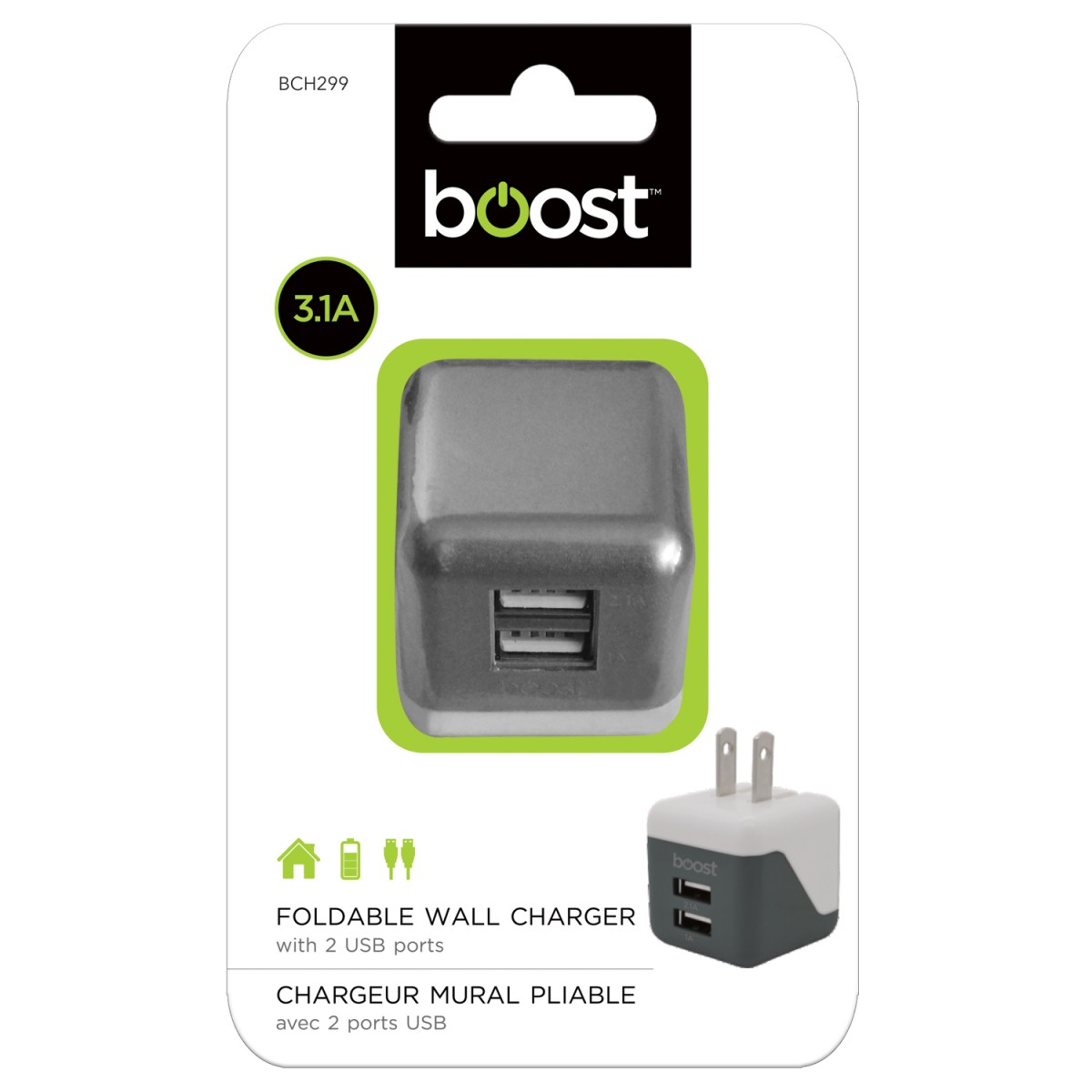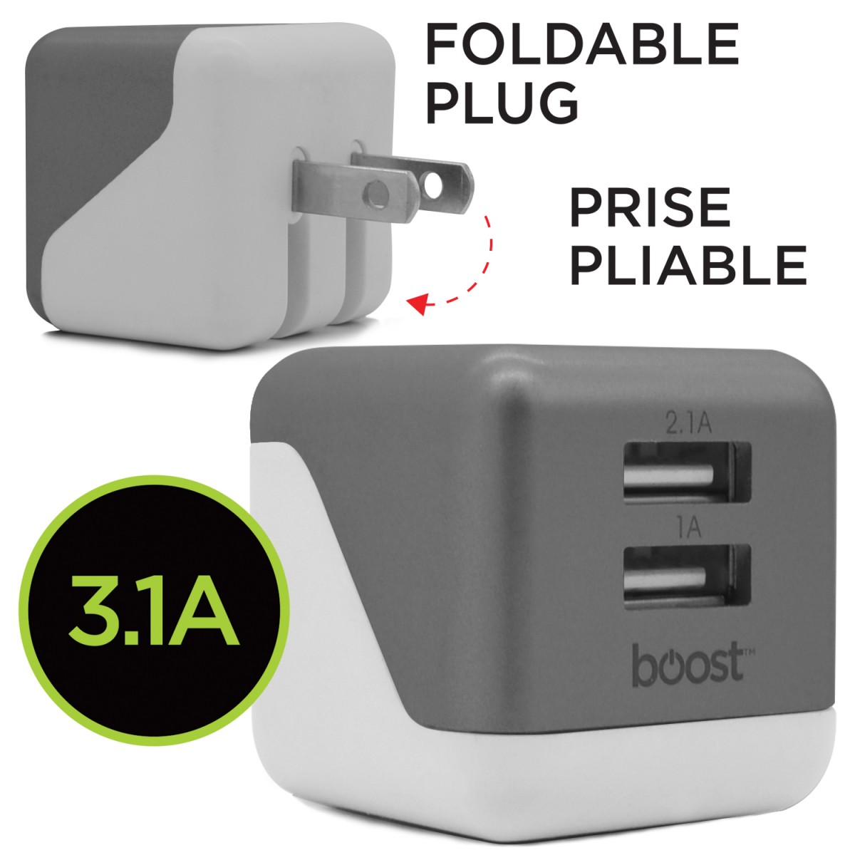 BOOST Compact 2-port USB charger with folding plug to charge your iPhone, iPad, or iPod model, smartphones, and other USB devices. 2.1A+1A.
