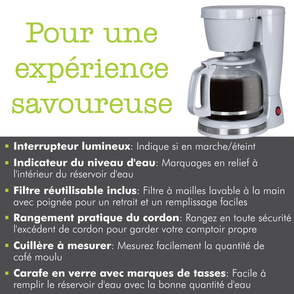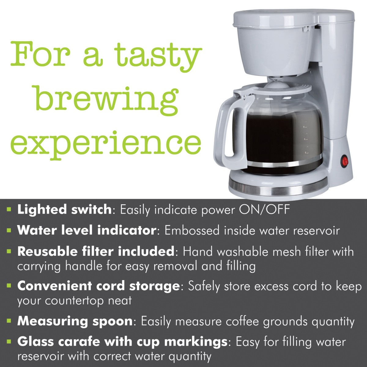 This compact 12-cup coffee maker features a lighted switch, water level indicator, and a reusable filter. It includes a measuring spoon, convenient cord storage, and a glass carafe with cup markings. Operates at 120VAC/60Hz/900W.