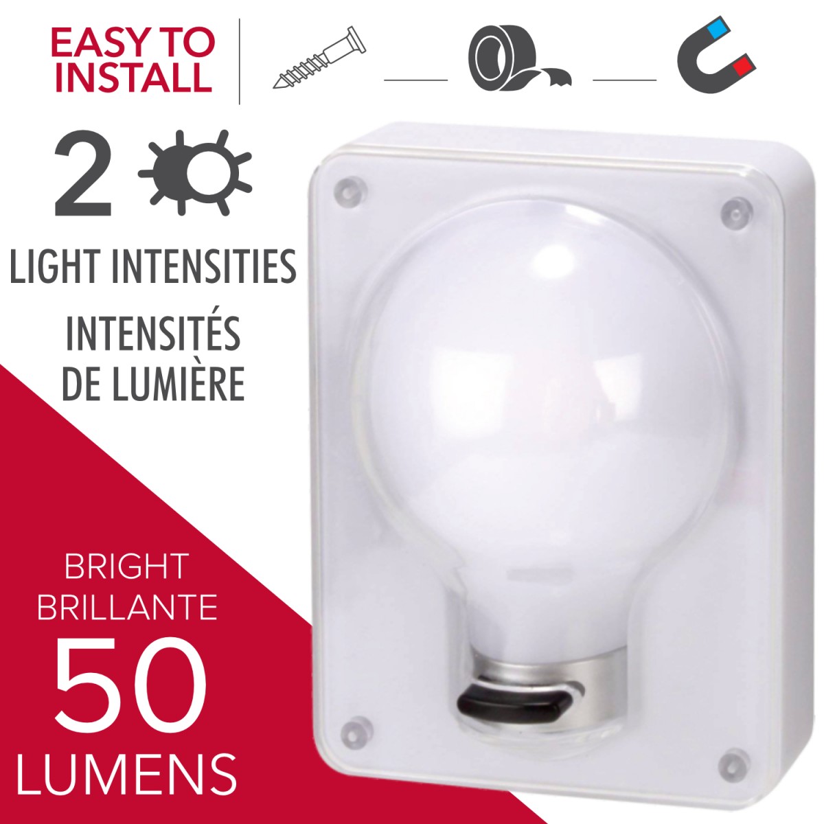 2 light intensities. Bright: 50 Lumens. Easy to install: Screw, tape or magnets. No electrical wires needed. Battery: 3x AAA (included).