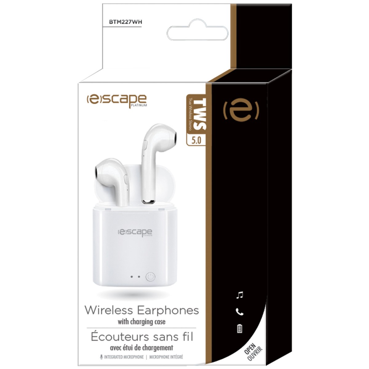 Escape Platinum TWS 5.0 Écouteurs sans fil avec microphone et étui de chargement. Utilisez un ou les deux. Couleur - blanc.