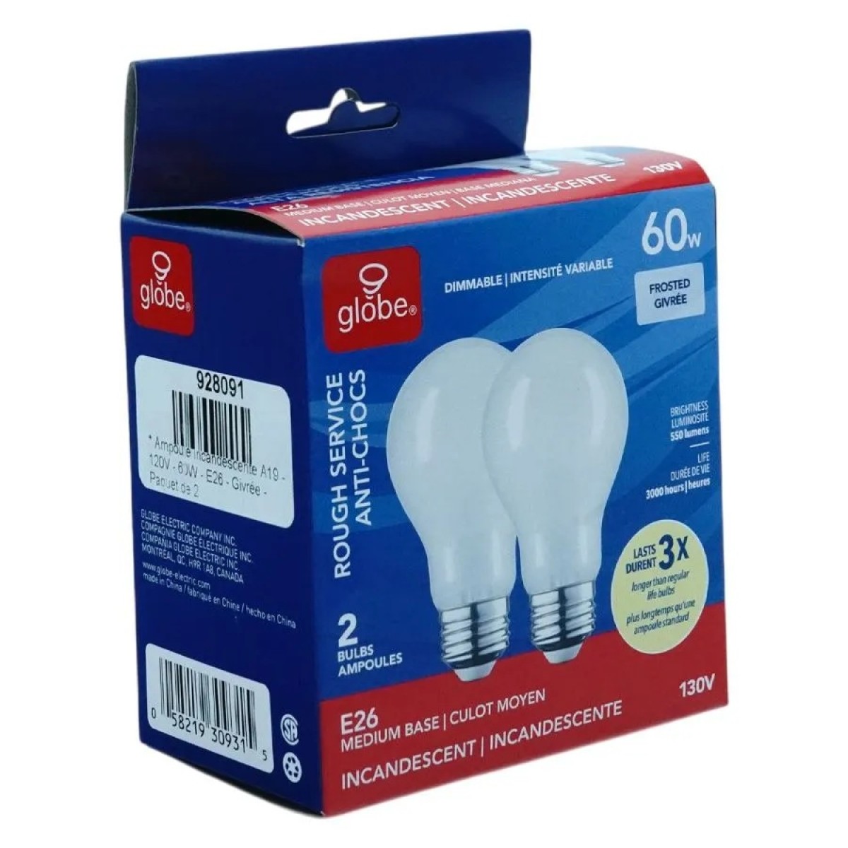 Apportez un éclairage chaleureux et fiable avec cette ampoule incandescente 60W A19 givrée, conçue pour fonctionner sous 130 V. Grâce à son culot E26 standard et sa compatibilité avec les gradateurs, elle s’installe facilement dans tous vos luminaires domestiques. Vendue en paquet de 2, cette ampoule incandescente 60W diffuse environ 550 lumens de lumière douce et confortable, idéale pour salons, chambres, cuisines et corridors.