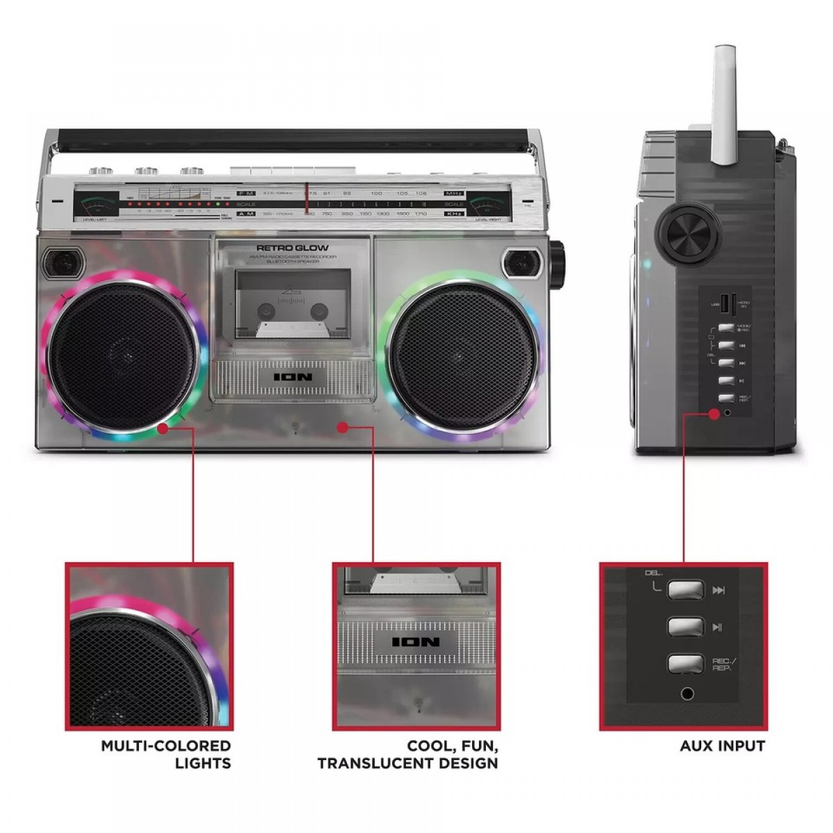 Le boombox Retro Glow arbore un look rétro tout en intégrant des éléments de design modernes. Son boîtier translucide illuminé, avec son éclairage d'ambiance, est un clin d'œil à la technologie actuelle. Alliant charme vintage et fonctionnalités contemporaines, il garantit des heures de divertissement aux mélomanes.