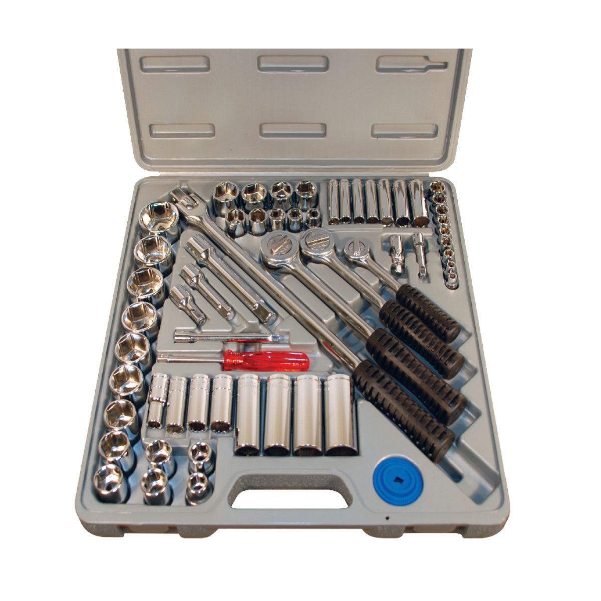 Contenu : (1) Cliquet réversible 1/4" x 12,7 cm avec disque de vitesse intégré | (1) Cliquet réversible 3/8" x 20,3 cm avec disque de vitesse intégré | (1) Cliquet réversible 1/2" x 25,4 cm avec disque de vitesse intégré | (1) Barre de force flexible 1/2" x 43,2 cm | (9) Douilles 6 pans 1/4" | (7) Douilles 6 pans profondes 1/4" | (9) Douilles 6 pans 3/8" | (8) Douilles 6 pans profondes 3/8" | (13) Douilles 6 pans 1/2" (3) Jeu de disques de vitesse | (2) Rallonges 1/4 po (5 cm et 10 cm) | (2) Rallonges 3/8 po (4,5 cm et 7,5 cm) | (1) Rallonge 1/2 po (12,5 cm) | (1) Poignée de rotation 1/4 po (15 cm) | (1) Joint universel 1/4 po.