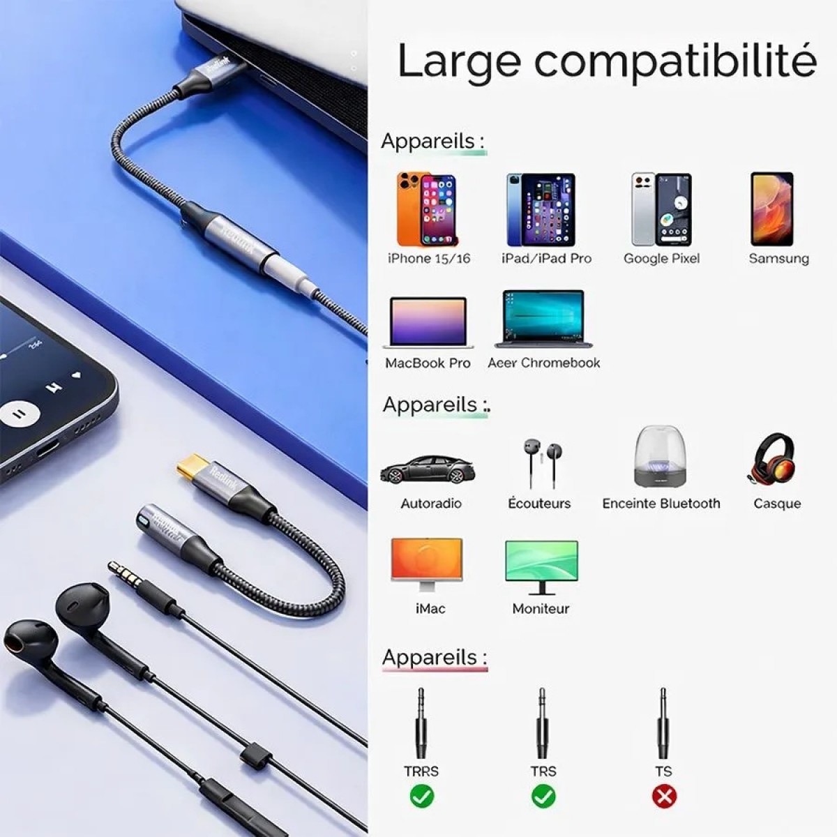 - Compatible avec ports USB-C et connecteurs audio 3,5 mm