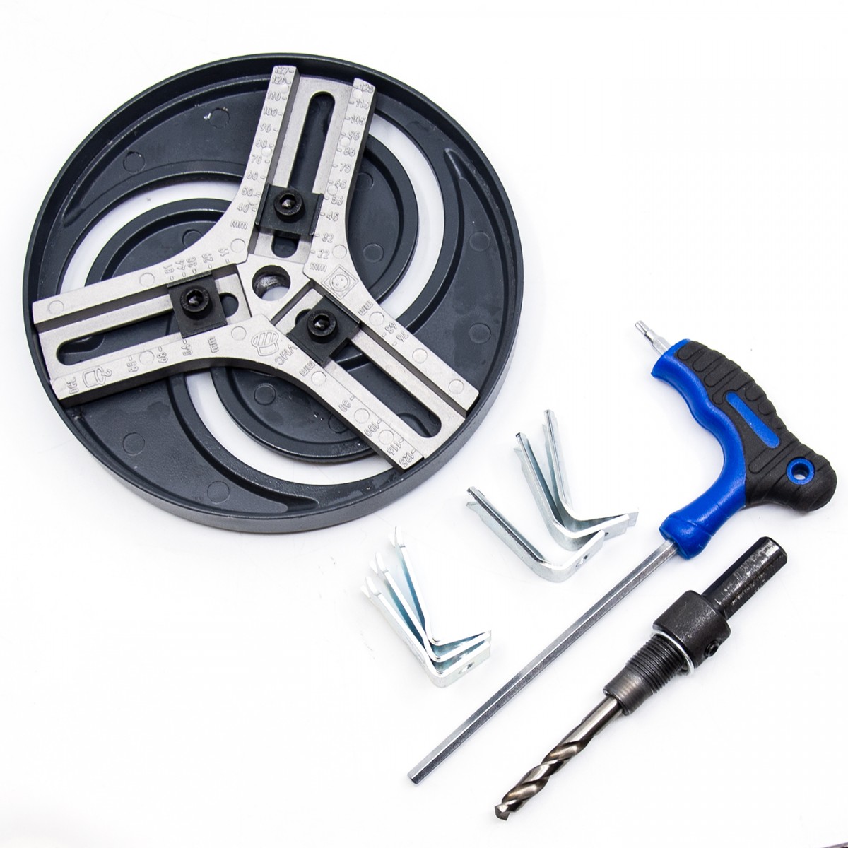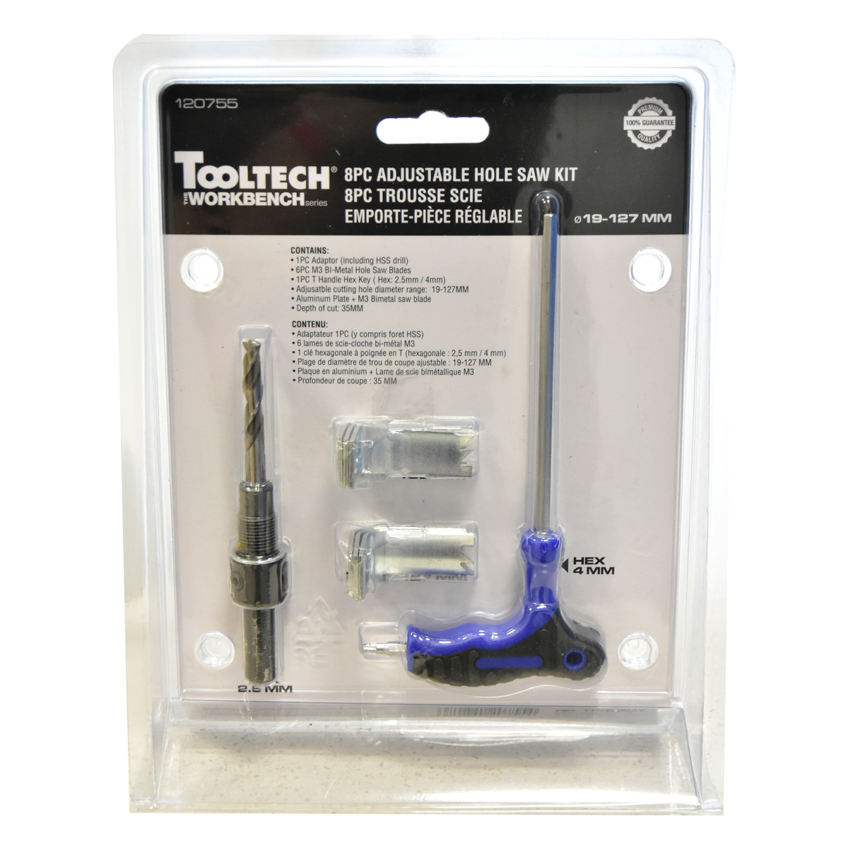 • Contenu : (1) Adaptateur (foret HSS inclus), (6) Lames de scie cloche bimétallique M3, (1) Clé Allen 2,5 mm/4 mm avec poignée en T, (1) Diamètre de trou de coupe réglable : 19-127 mm, (1) Plaque en aluminium + lame de scie bimétallique M3.